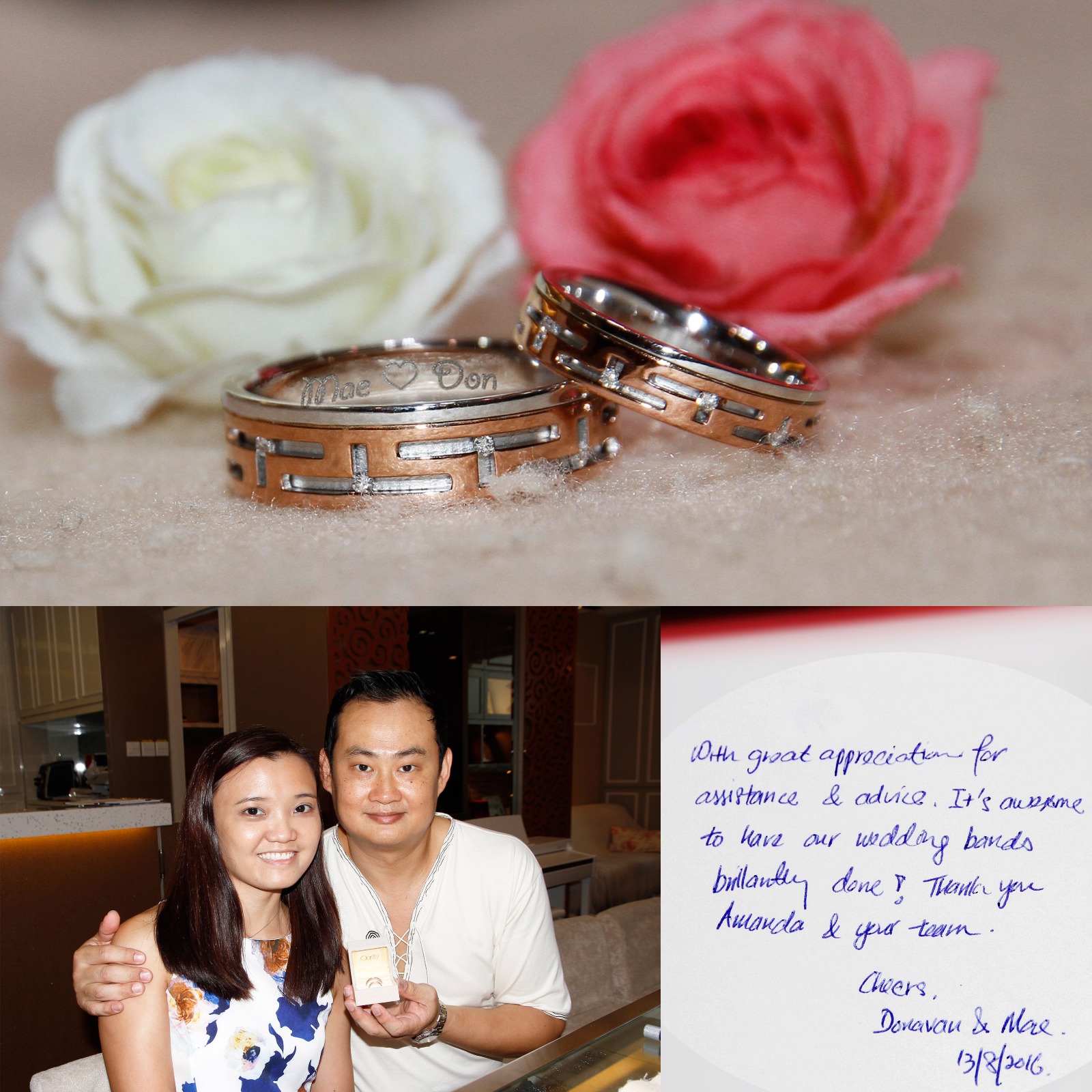 “With great appreciation for assistance & advice. It’s awesome to have our wedding bands brilliantly done! Thank you Amanda & your team.” – Cheers, Donavan &Mae