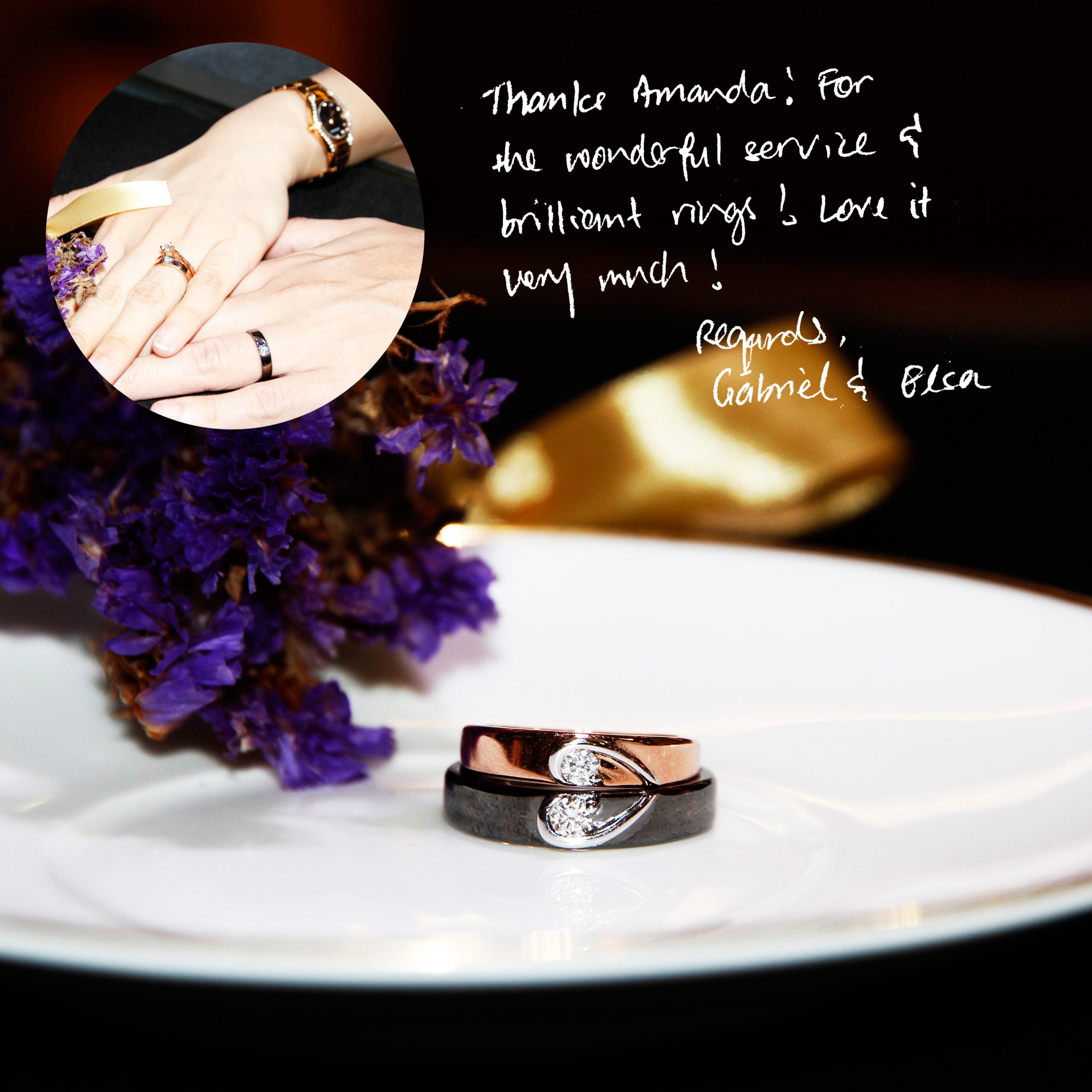 “Thanks Amanda! For the wonderful service & brilliant rings! Love it very much” – Regards, Gabriel & Elsa