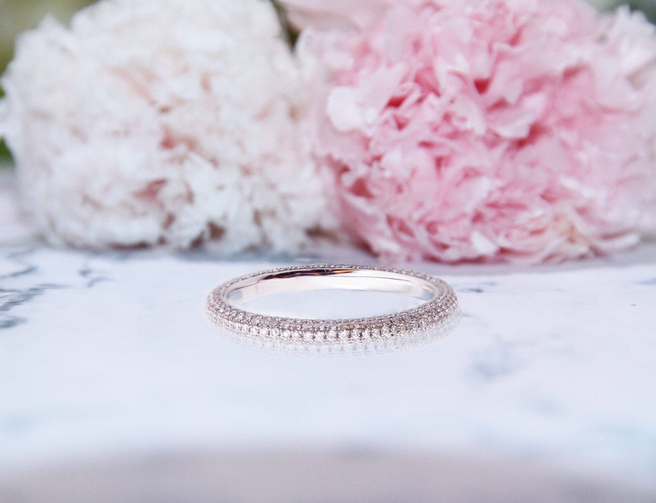 In pavé setting, the diamonds are set in place by teeny metal beads. Pavé set eternity ring is often used to hold smaller diamonds to generate a paved appearance. The design is greatly focusing on the sparkle of the diamonds by minimizing the metal parts.