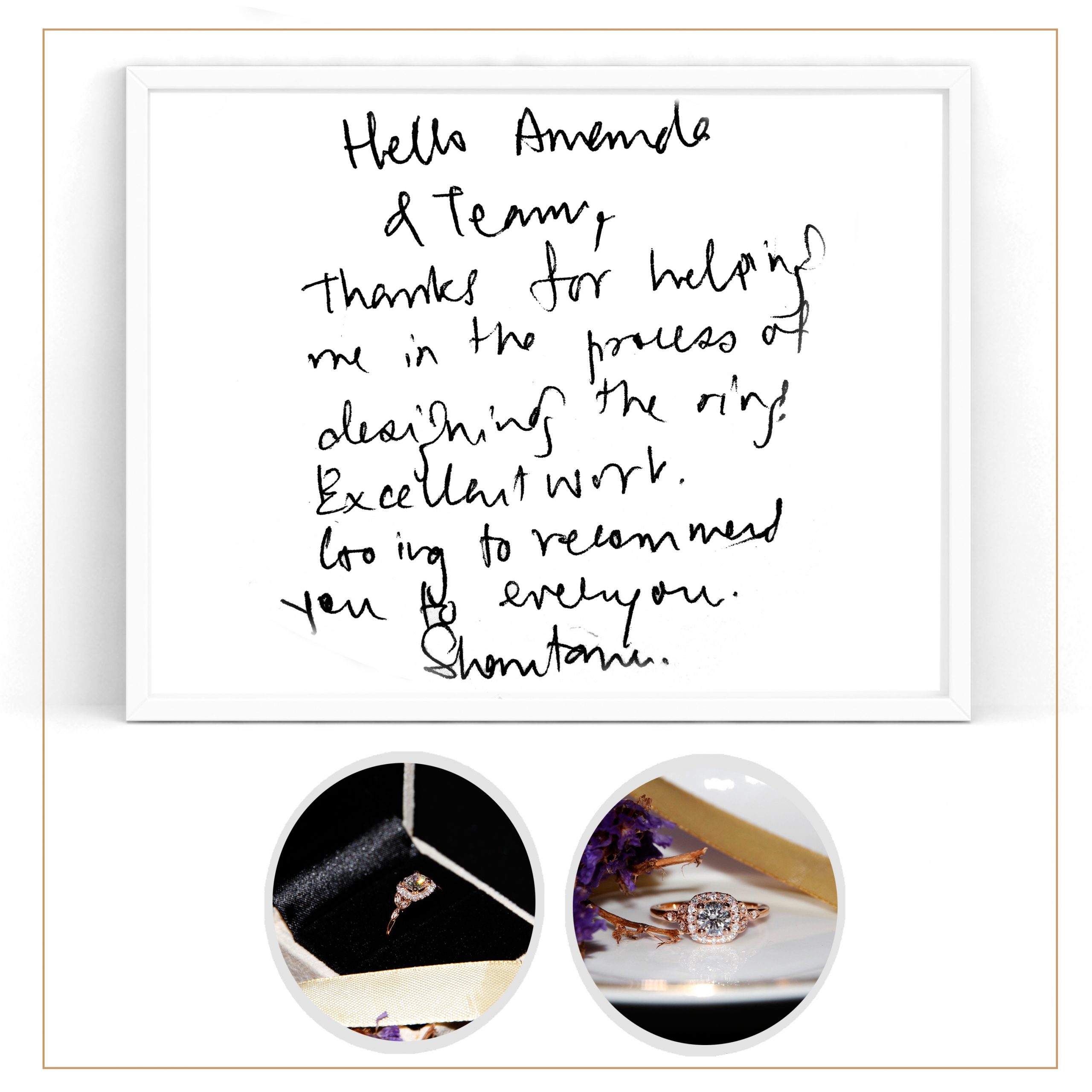 “Hello Amanda & team, thanks for helping me in the process of designing of the ring. Excellent work. Going to recommend you to everyone.” – Shantanu