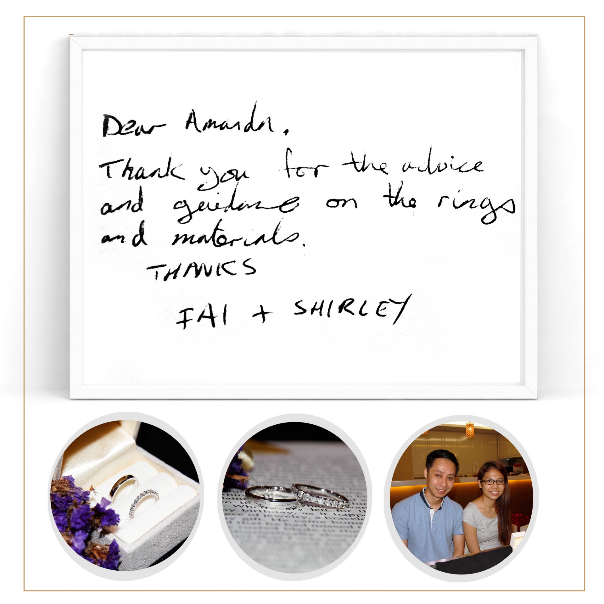 “Dear Amanda, thank you for the advice and guidance on the rings and materials. Thanks.” – Fai & Shirley