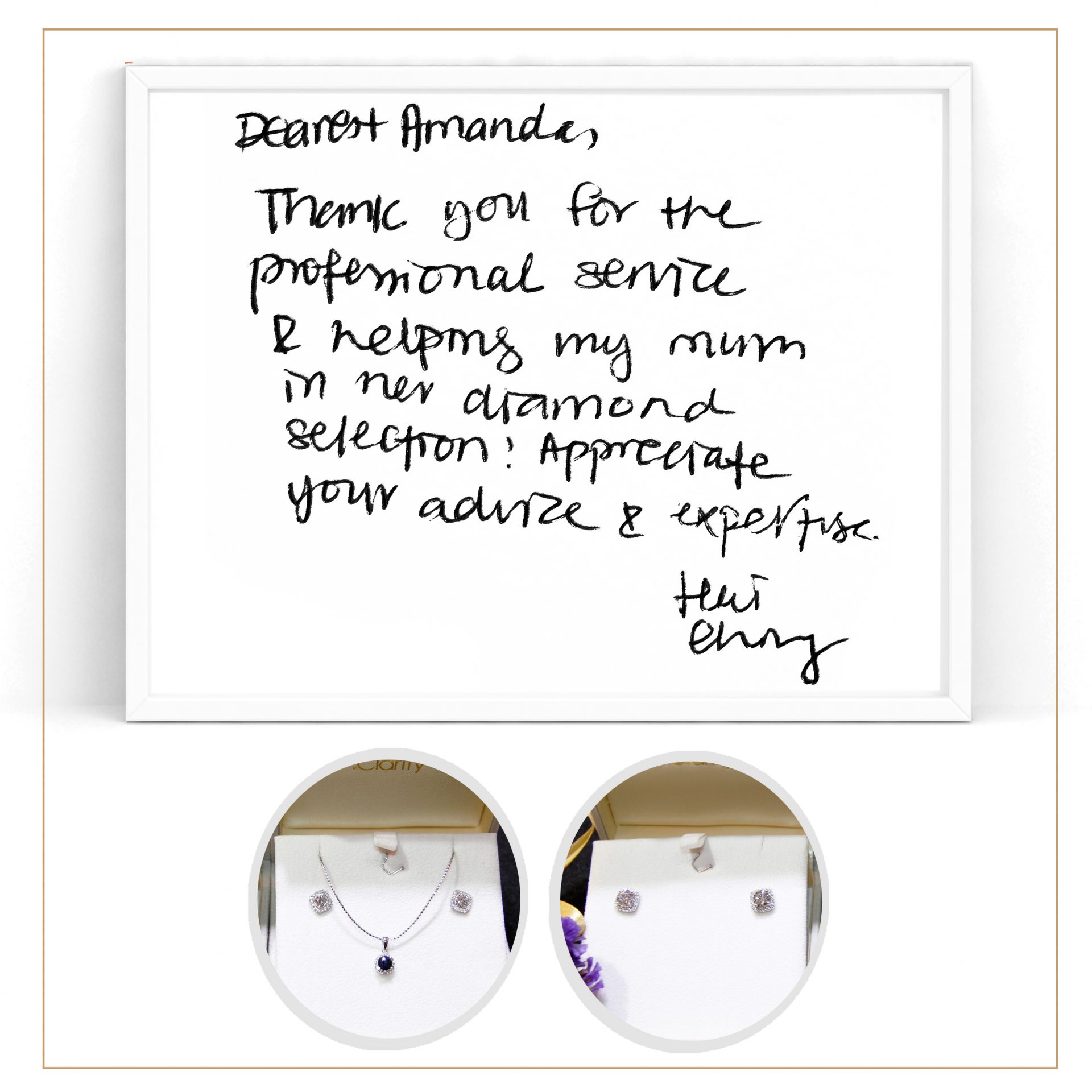 “Dearest Amanda, thank you for the professional service & helping my mum in her diamond selection! Appreciate your advice & expertise.” – Hui Ching