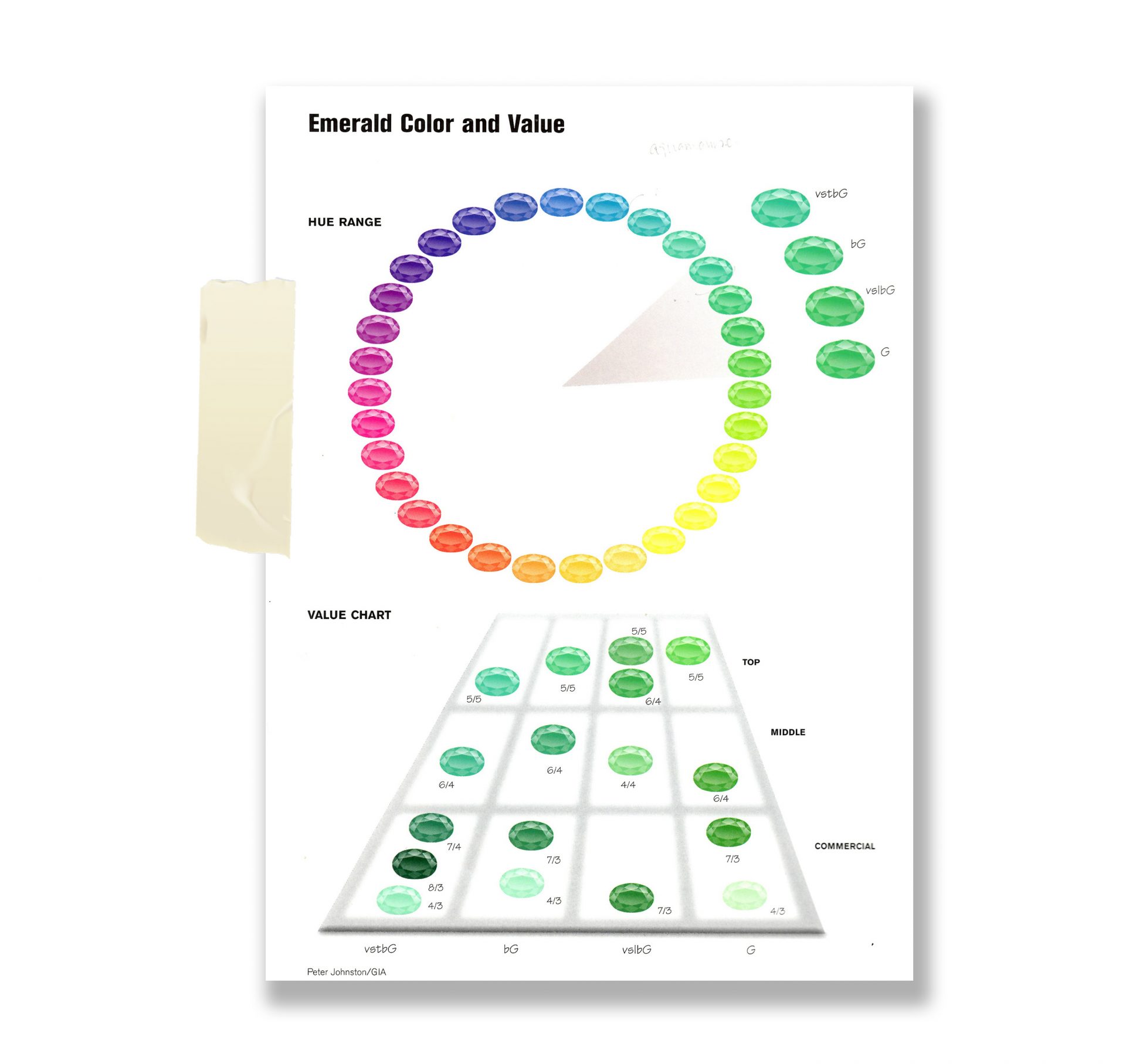 The four colors outside the hue wheel show the range for emerald. The value chart arranges emerald hue, tone, and saturation from most to least desirable.