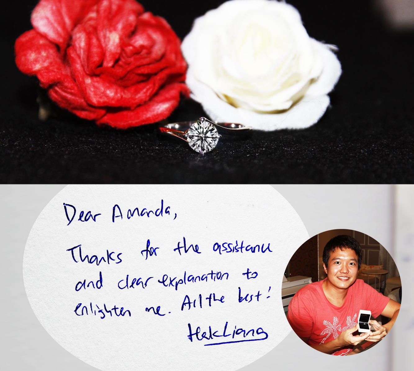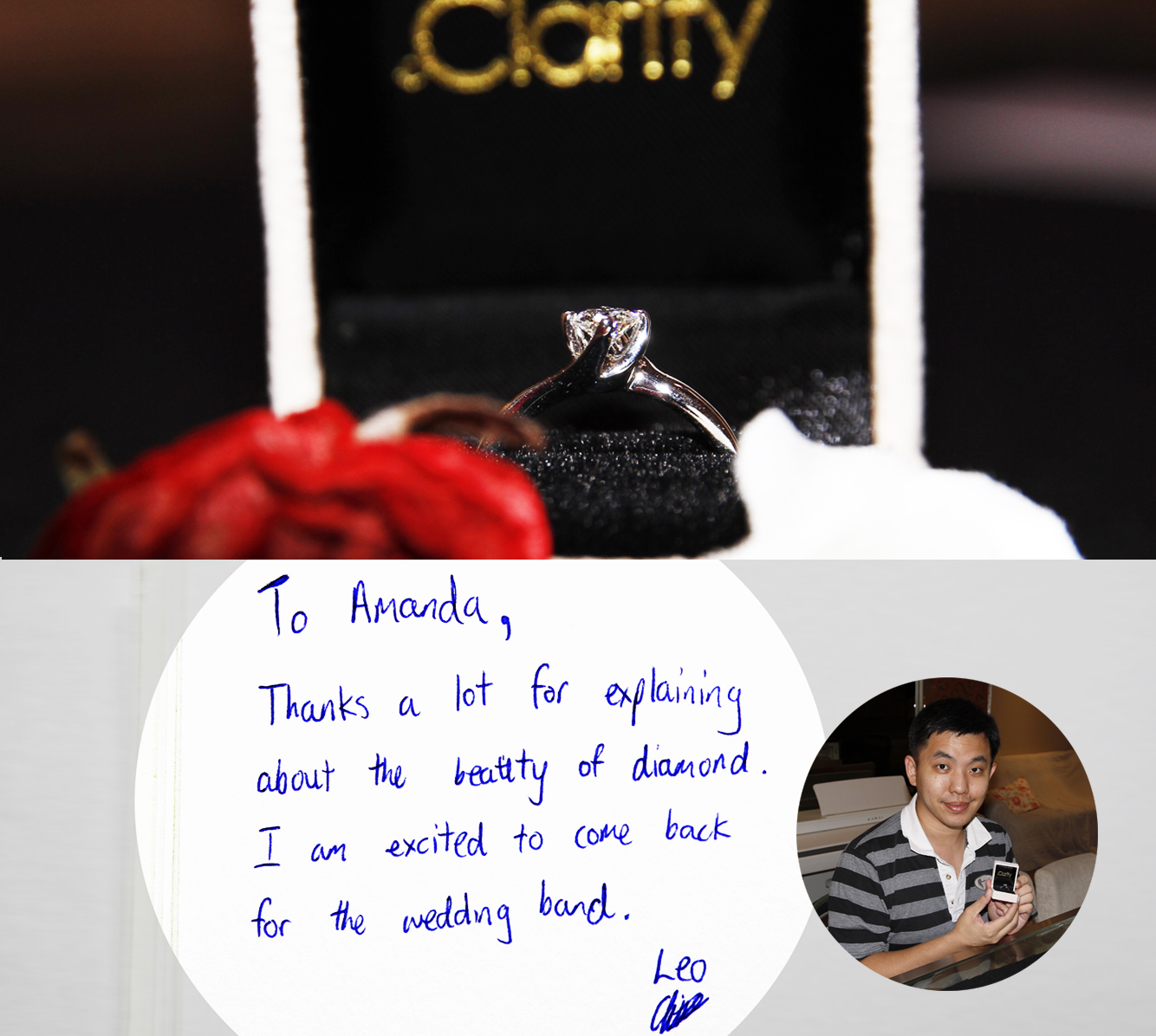 “To Amanda, Thanks a lot for explaining about the beauty of diamond. I am excited to come back for the wedding band.” – Leo