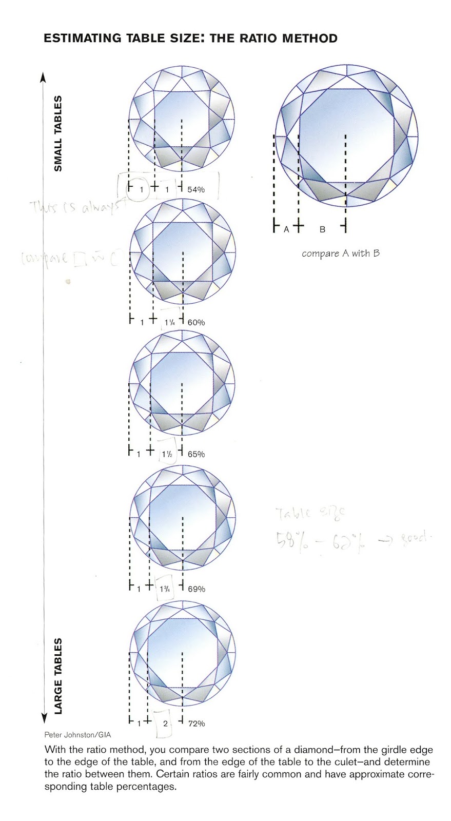 With the ratio method, you compare two sections of a diamond-from the girdle edge to the edge of the table, and from the edge of the table to the culet-and determine the ratio between them. Certain ratios are fairly common and have approximate corresponding table percentages.