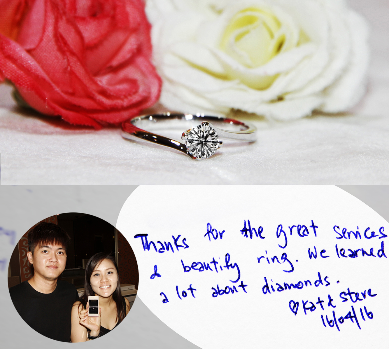 “Thanks for the great services & beautify ring. We learned a lot about diamonds.”- with love, Kat & Steve