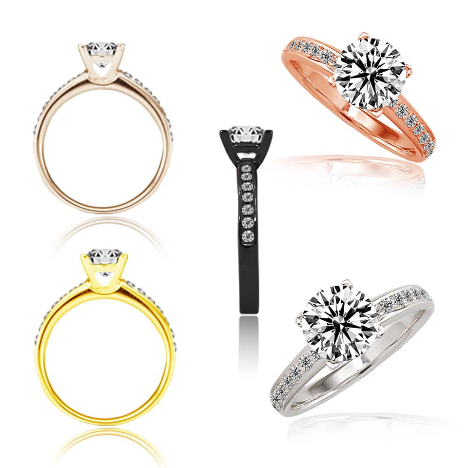 eClarity Classic Extravagant ring setting, scintillating with 14 round brilliant diamonds, 2.1 carat in 18k gold, in white, rose, yellow, champagne and black, gloss. (DRC EXT 565).