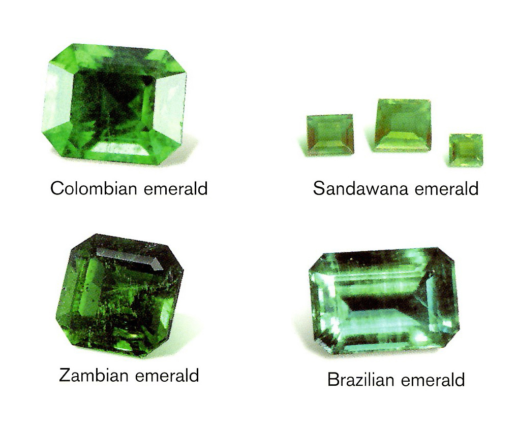 An emerald’s hue, tone, and saturation determine its value. Above photo show color and trade by a source name. Some color terms for emerald are Colombian, Zambian, Sandawana, and Brazilian.