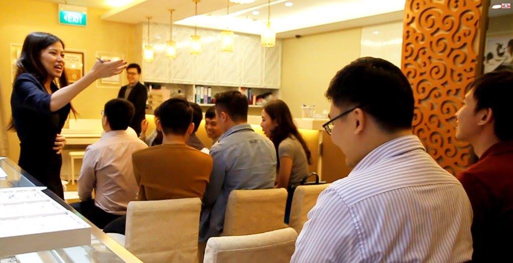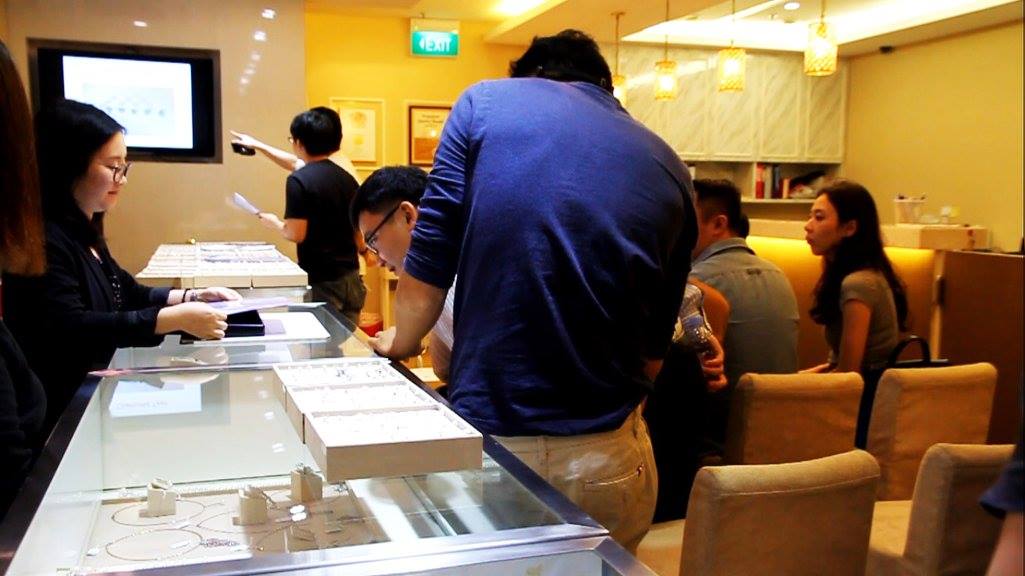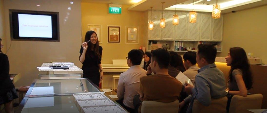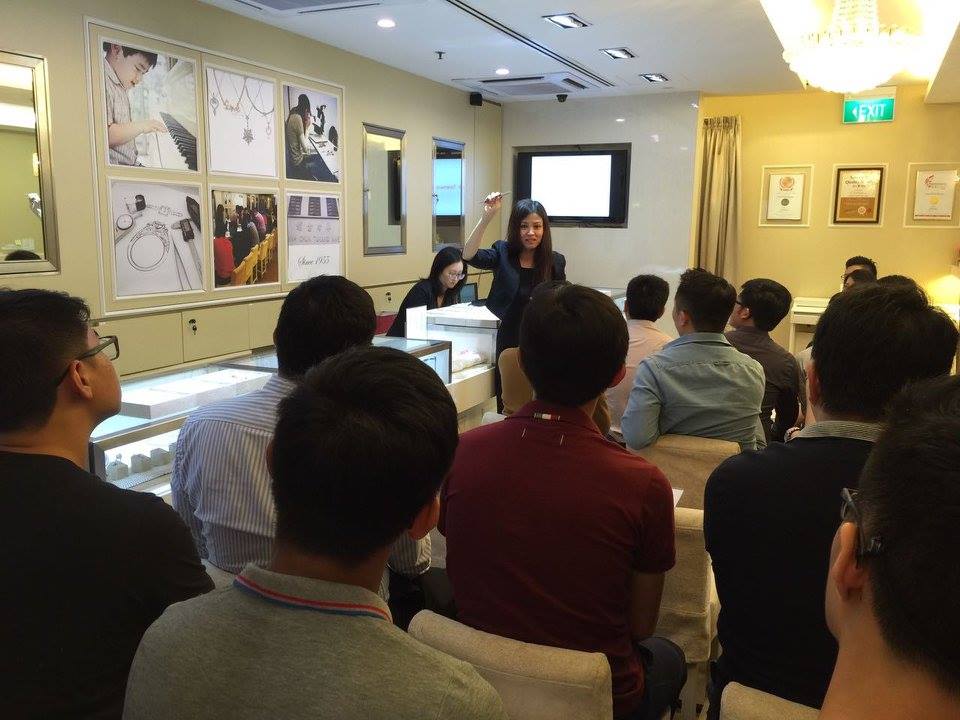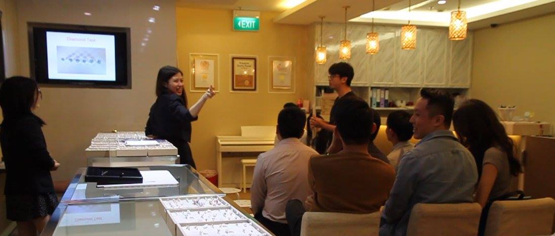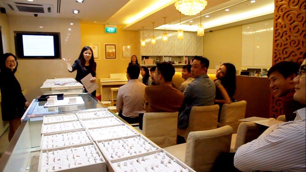 Our Gemologist, Amanda Koo, demonstrating the effect of lighting on Fire, Brilliance and Scintillation.