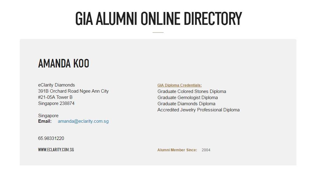 eClarity, and its GIA Gemologist Amanda Koo, is listed on the official GIA alumni online directory.