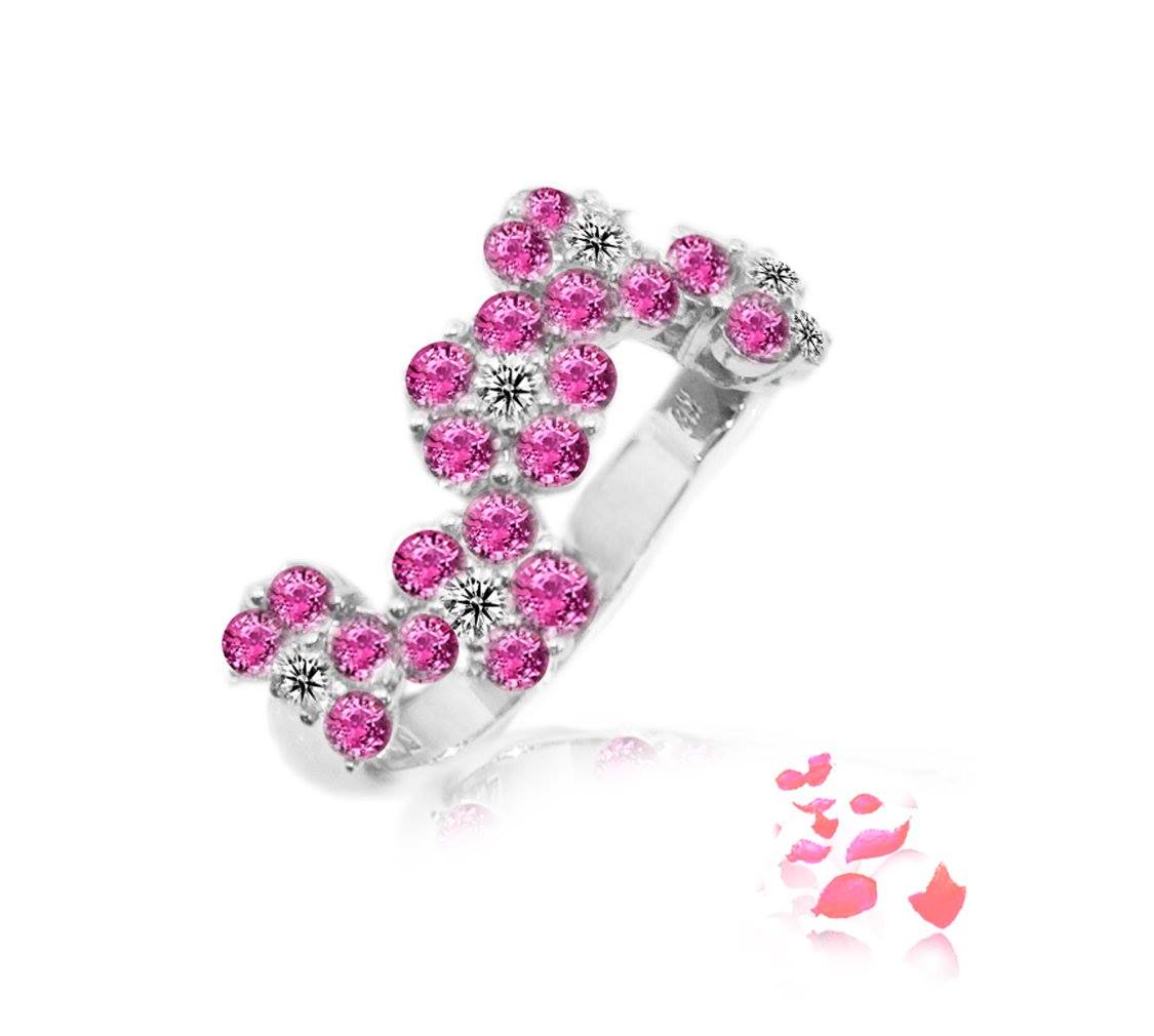 Diamond ring scintillating with 23 #pinksapphires 1.56 carat and 5 round brilliant diamonds 0.27 carat in 18k gold, white. (R00379b)