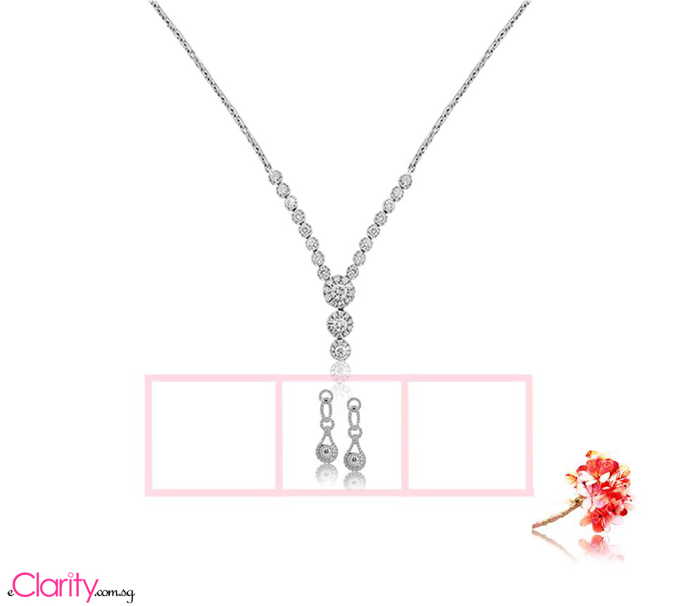 Diamond necklace scintillating with 49 round brilliant diamonds 1 carat in 18k gold, white (N00189). Diamond earrings scintillating with 2 round brilliant diamonds 0.11 carat, 16 round brilliant diamonds 0.16 carat and 126 round brilliant diamonds 0.61 carat in 18k gold, white. (E00436) –https://www.eclarity.com.sg/index.php?CategoryId=6&ViewAll=1&from