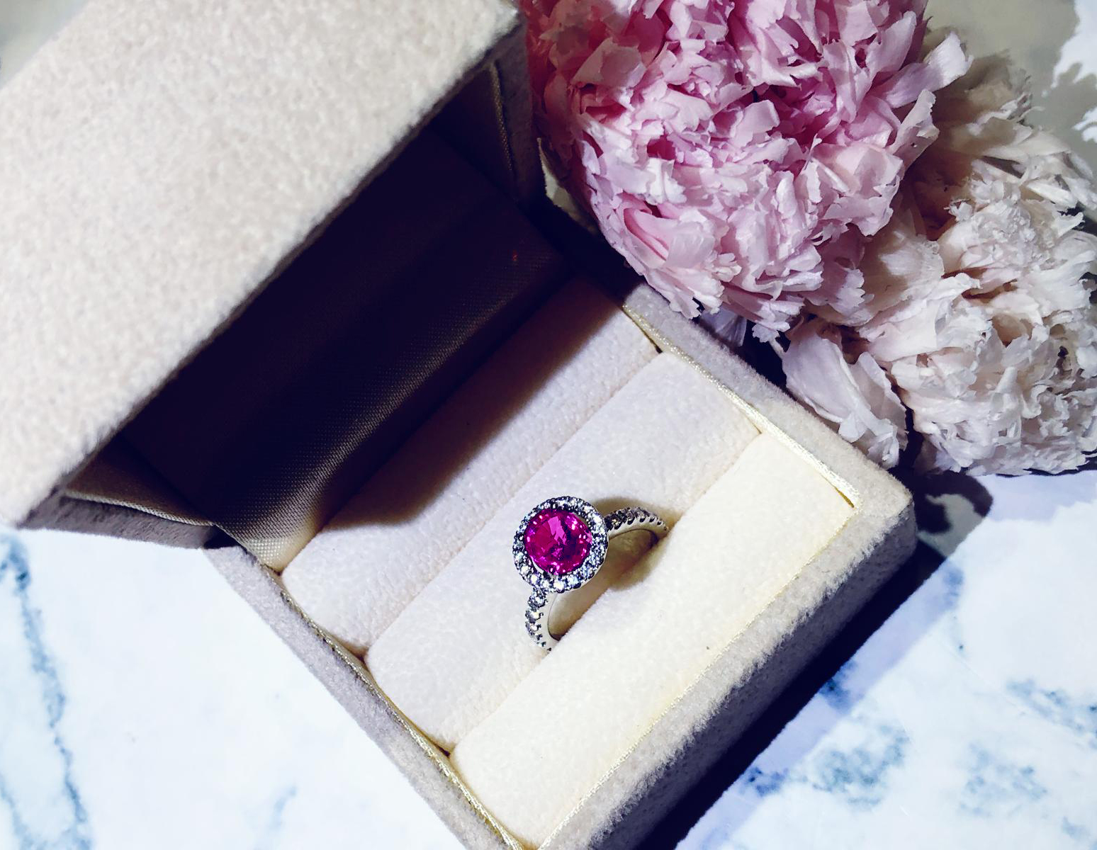 Elegant craftsmanship and unparalleled gemstone selection by GIA gemologist brings you classy rendition of colors. Designed by eClarity designers for the Sophistication of eClarity: this 18k white gold ring highlights a pastel pink sapphire surrounded with halo of diamonds. #eClarity #pinksapphire #engagmentring