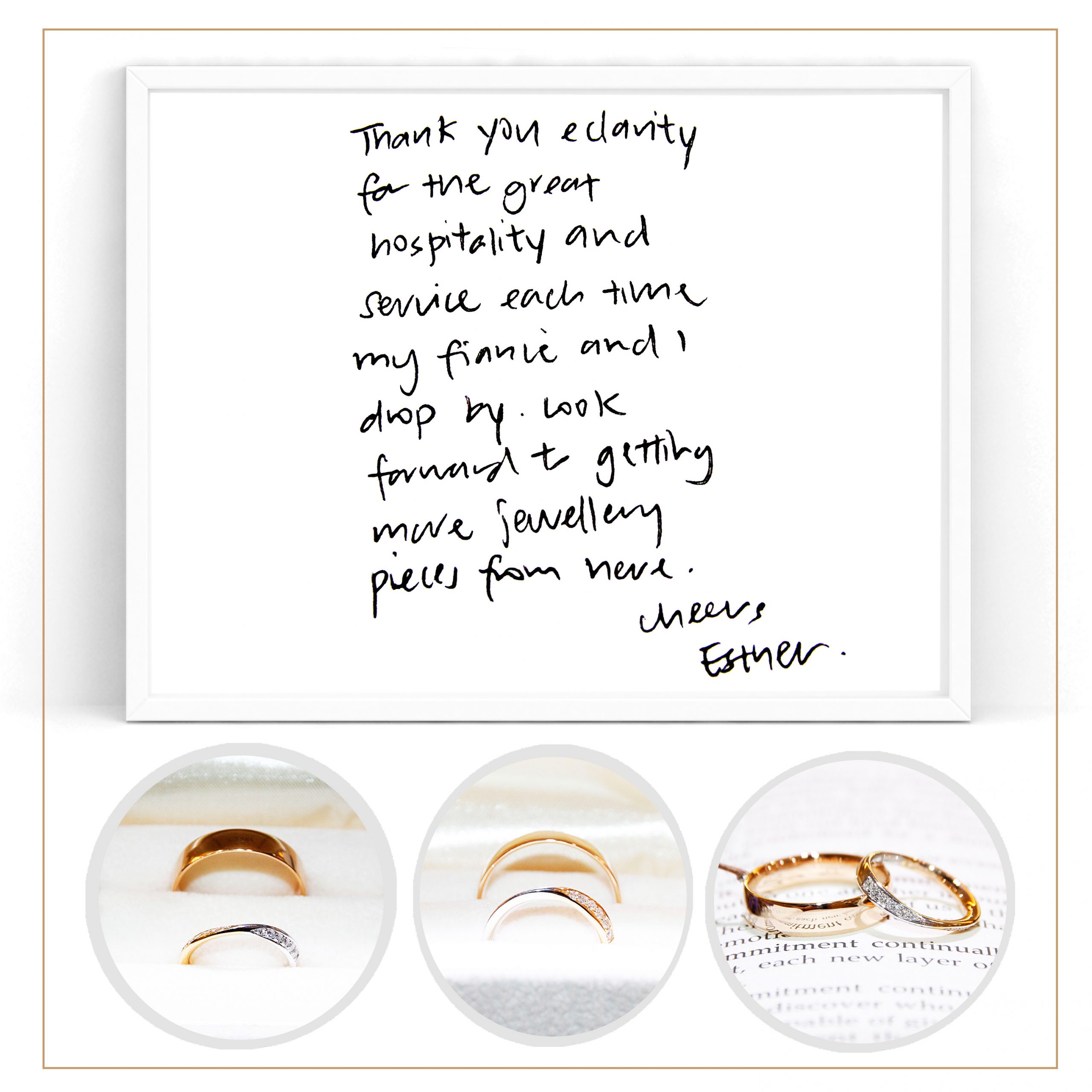 “Thank you eClarity for the great hospitality and service each time my fiancé and I drop by. Look forward to getting more jewellery pieces from here.” – Cheers, Esther