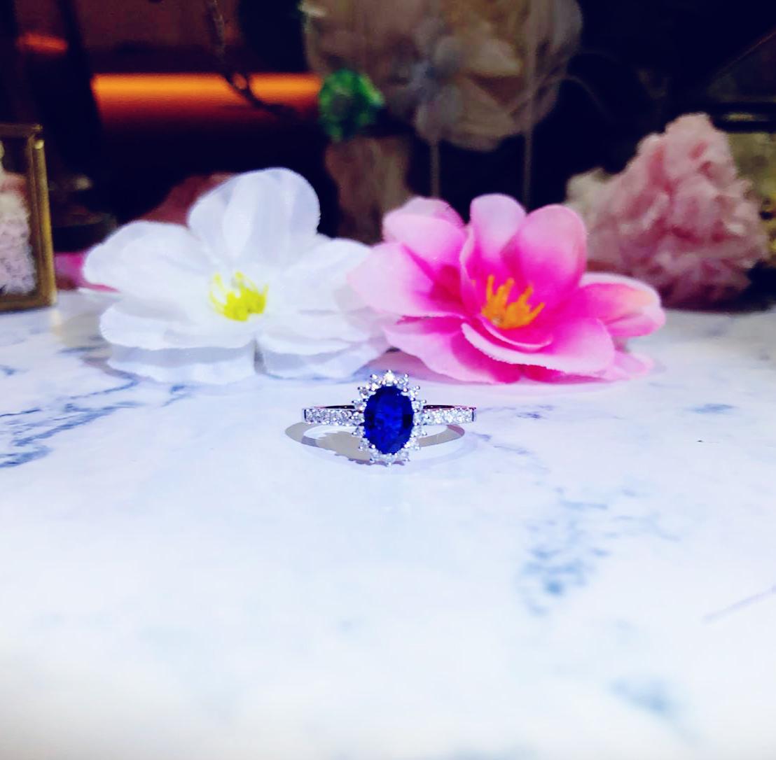 Timeless elegance. A eClarity one carat royal blue oval sapphire is gracefully mounted in starburst flower halo design in 18k white gold that highlights sophistication. #eClarity #bluesapphire #engagmentring #haloring