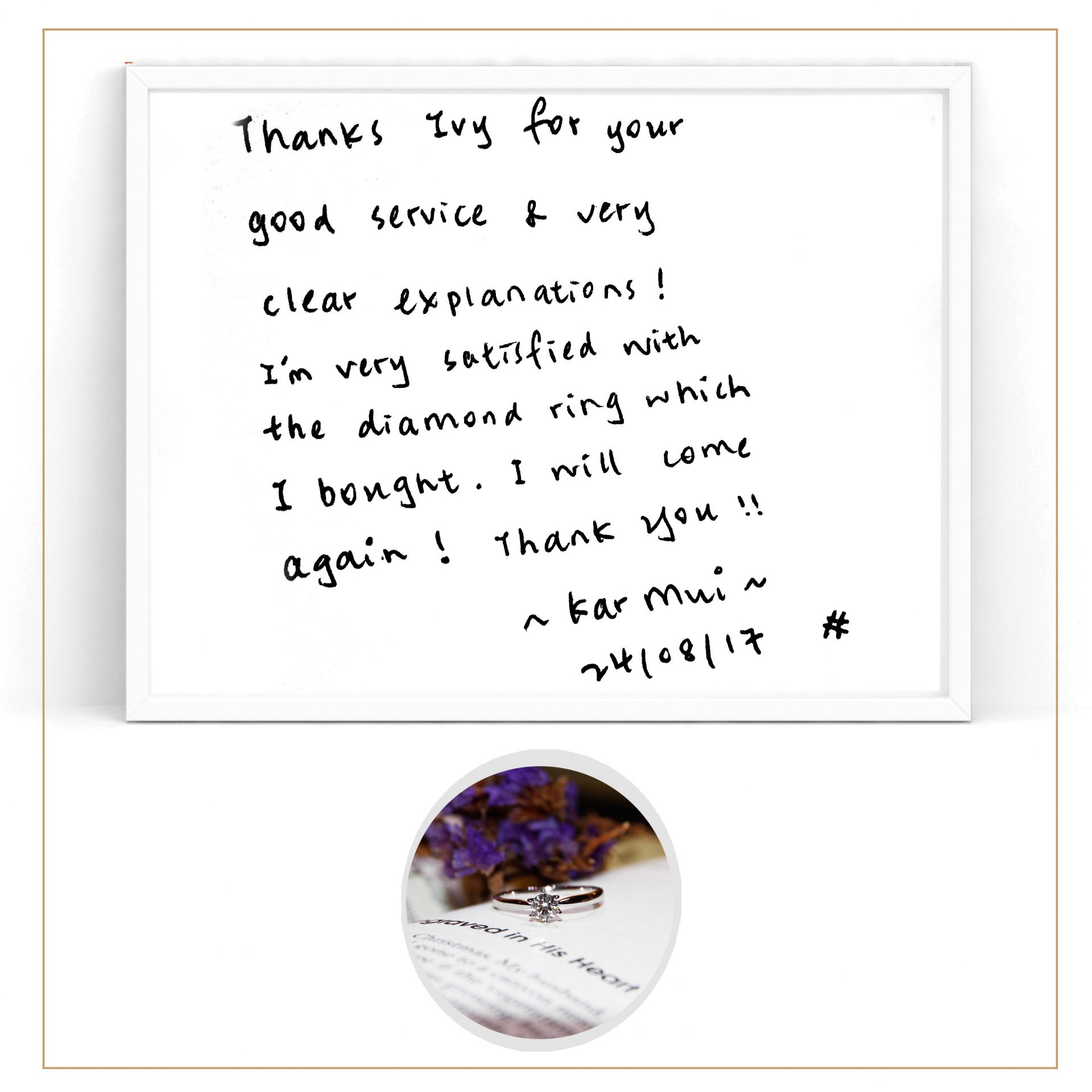“Thanks Ivy for your good service & very clear explanations! I’m very satisfied with the diamond ring which I bought. I will come again! Thank you!!” – Kar Mui