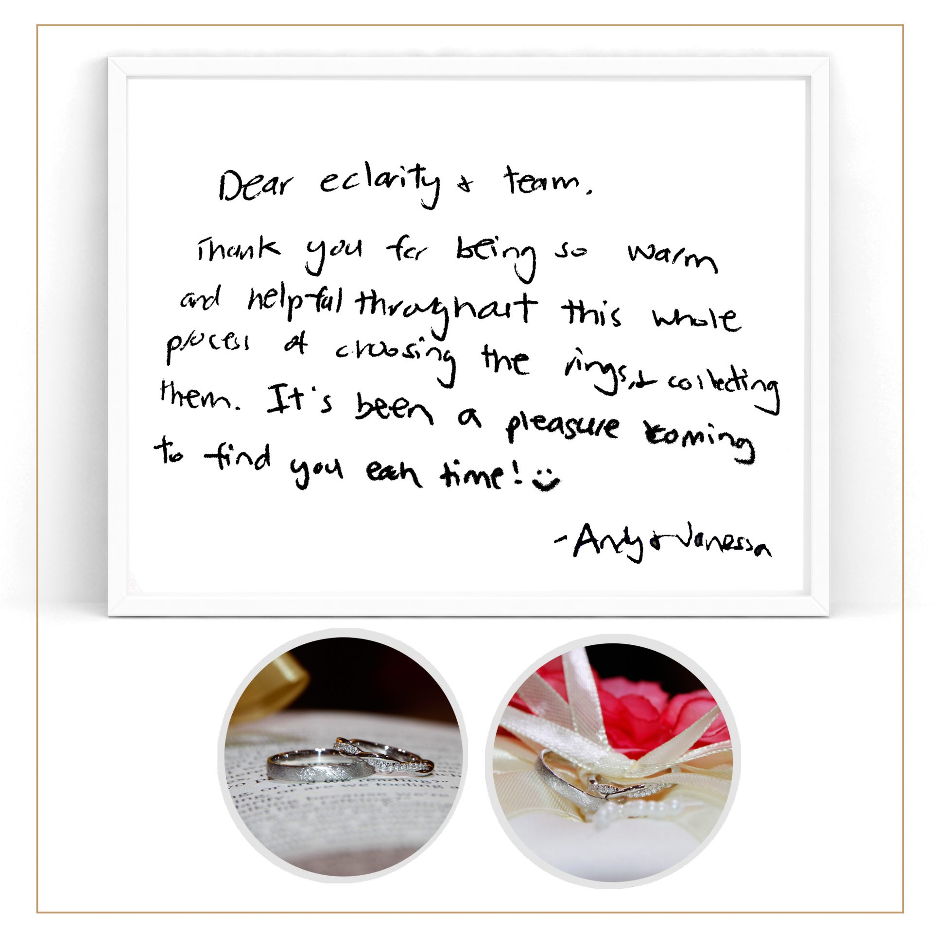 “Dear eClarity & team, thank you for being so warm and helpful throughout this whole process of choosing the rings & collecting item. Its’s been a pleasure coming to find you each time! ?”- Andy & Vanessa