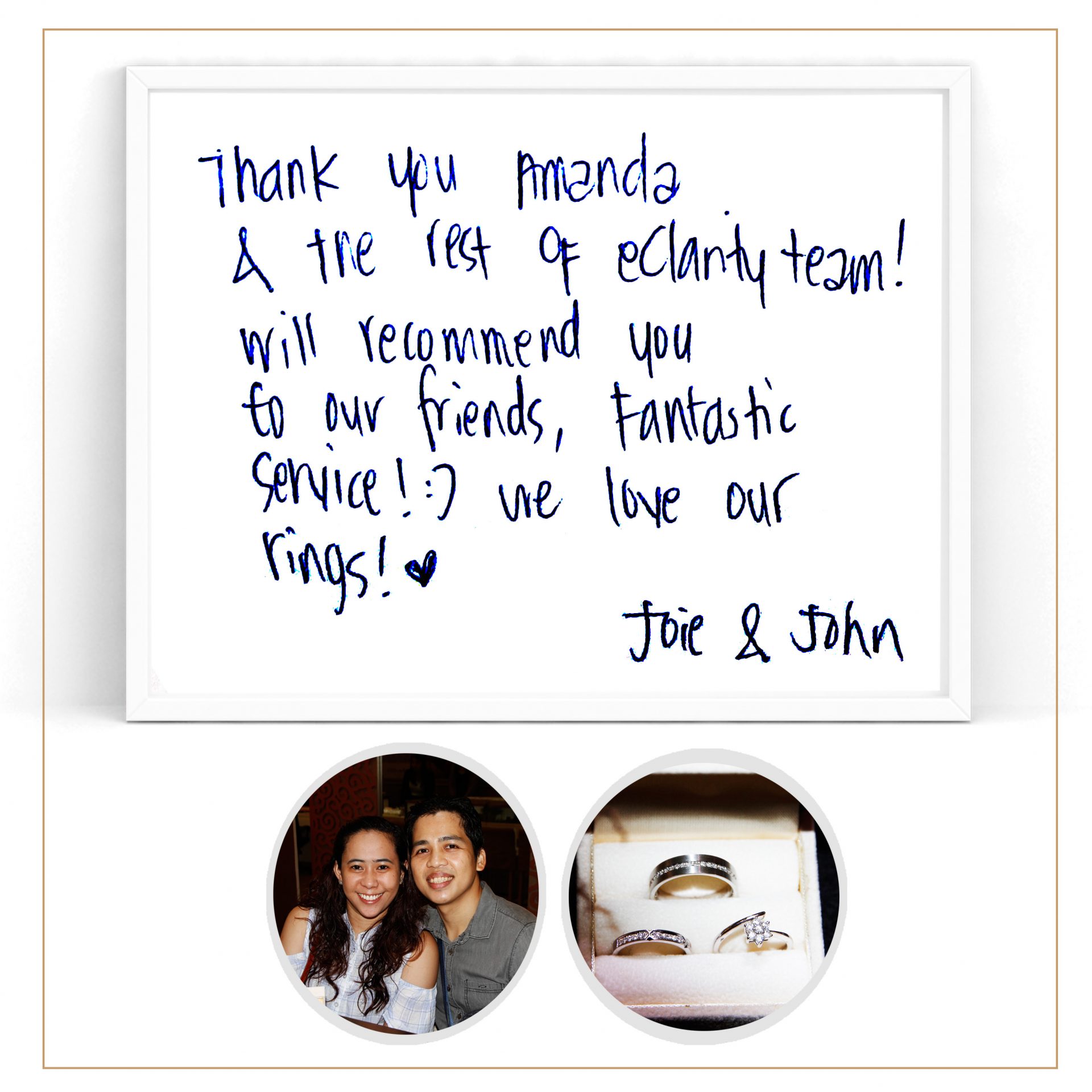 “Thank you Amanda & the rest of eClarity team! Will recommend you to our friends, fantastic service! ? We love our rings!” – Joie & John