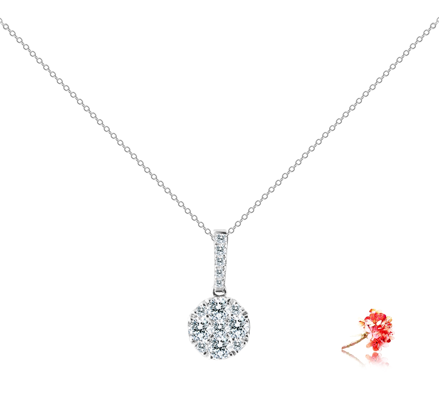 Love glow. Discover #eClarity #diamondpendant – a timeless theme. Here, 14 round brilliant matching diamonds flawlessly mounted collectively in a 18k white gold pendant, warming up the heat of dazzling love. #shoplocalbrands