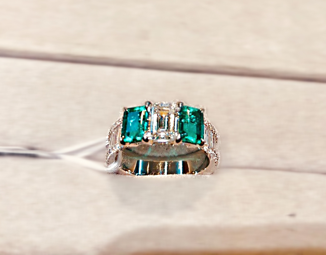 #eClarityexclusivecollection – Exceeding expectation. The team of gemologist and mastercraftmen glorifies classy emerald green in this trilogy ring. This ring is designed with distinct clarity with the row of baguette diamonds on the ring shank, it is both elegant and whimsical. The elaborated, hand-mounted diamonds highlight the premium emerald gemstone and unique shapes, beautifully expressing its finest details.