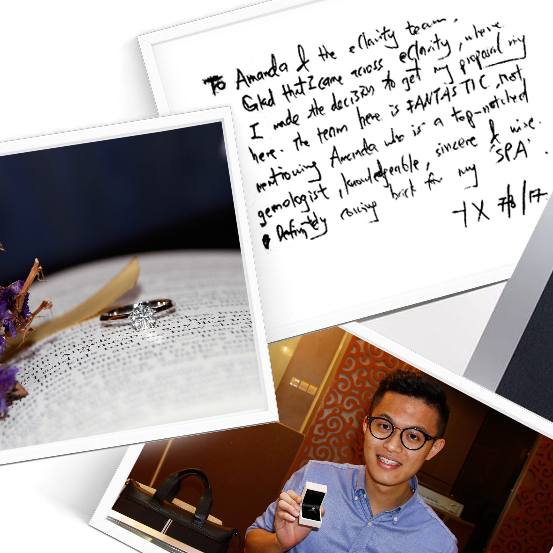 To Amanda & the eClarity team, glad that I came across eClarity, where I made the decision to get my proposal ring here. The team here is FANTASTIC, not mentioning Amanda who is a top-notched gemologist, knowledgeable, sincere & wise. Definitely coming back for my ‘SPA’.” – Yong Xiang