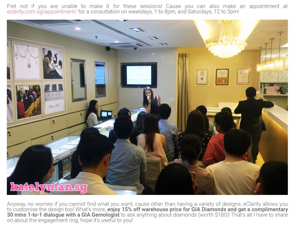 Singapore Blogger Katelyn Tan recommends couples to attend eClarity’s monthly diamond talk. The blog article “[Wedding 101] also shares Tips to Choosing Your Perfect Engagement Ring” from her perspective.