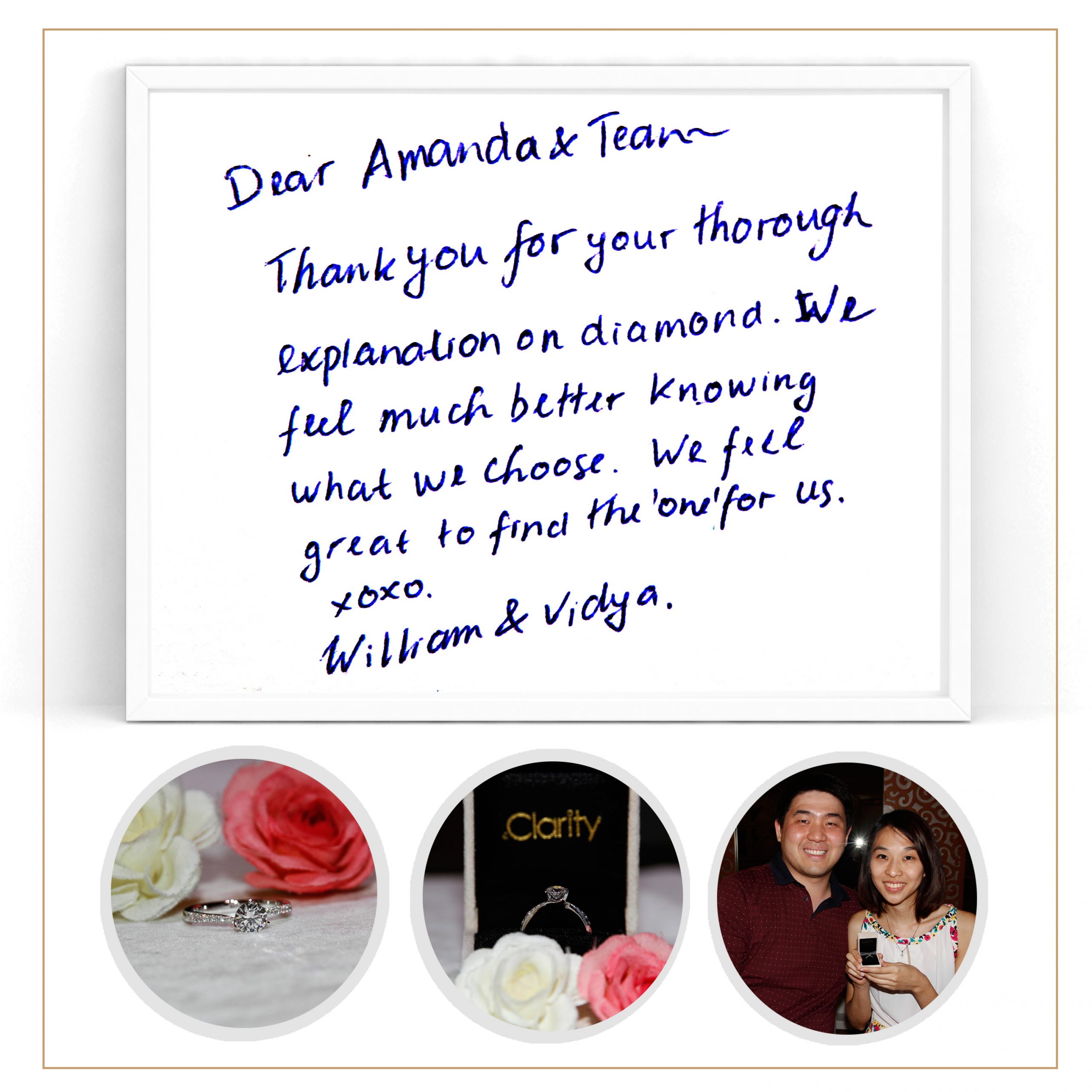 “Dear Amanda & team, thank you for your thorough explanation on diamond. We feel much better knowing what we choose. We feel great to find the ‘one’ for us. XOXO” – William & Vidya