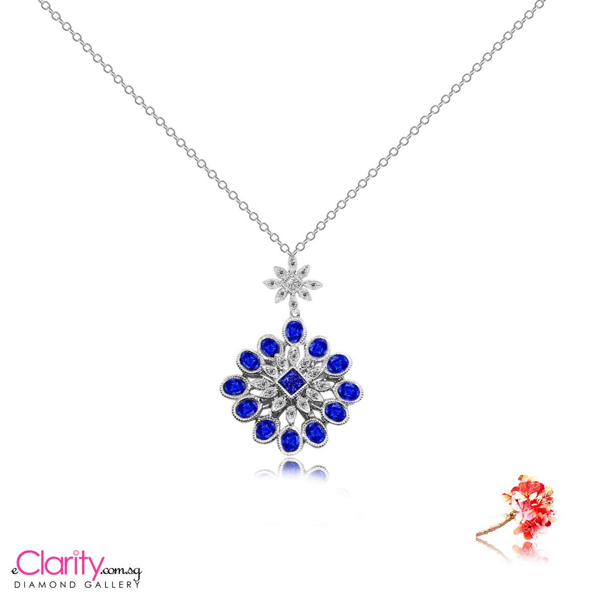 Something new, something old, something borrowed, something blue. Blue Sapphire has been associated with royalty and romance for centuries. Here is a blue sapphire pendant with 1 princess cut blue sapphire weighted 0.22 carat, 12 Oval blue sapphire – 2.37 carat, 1 princess cut diamond – 0.07 carat and 20 round brilliant diamonds – 0.11 carat in 18k gold, white.