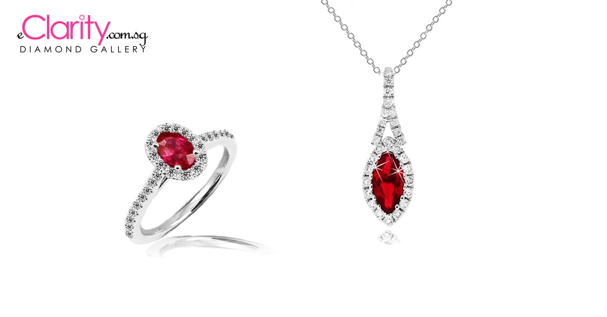 Red is the color of love and passion. Ruby ring above has an oval shape ruby weighted 0.57ct and surrounded by 32 round brilliant diamonds 0. 3 carat in 18k gold, white; while the pendant features one marquise ruby weighted 0.5 carat and 28 round brilliant diamonds 0.19 carat in 18k gold, white. Not sure what to give to your mum, get a piece of ruby jewellery to show your love to mum.