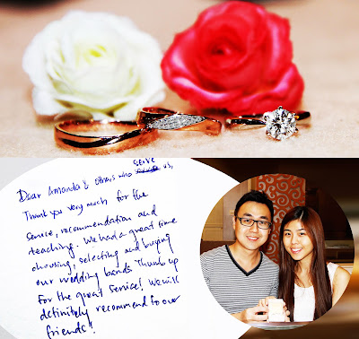 “Dear Amanda & others who serve us, thank you very much for the service, recommendation and teaching. We had a great time choosing, selecting and buying our wedding bands. Thumb up for the great service! We will definitely recommend to our friends!”- Kar Kay & Ee Qing