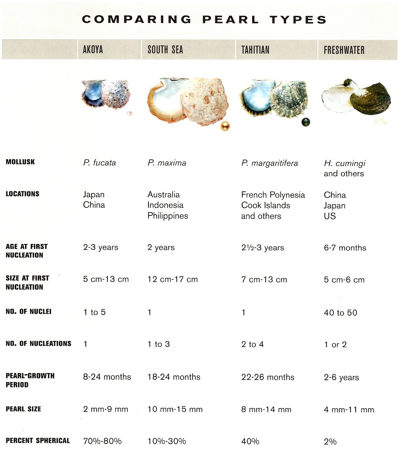 Cultured whole pearls are categorized by whether they’re grown in salt or fresh water, by the species of mollusk that produces them, and by geographical regions where they’re grown. There are four major types of cultured whole pearls, Akoya, South Sea, Tahitian, Freshwater Courtesy: GIA. Resource: Amanda. #eClarity