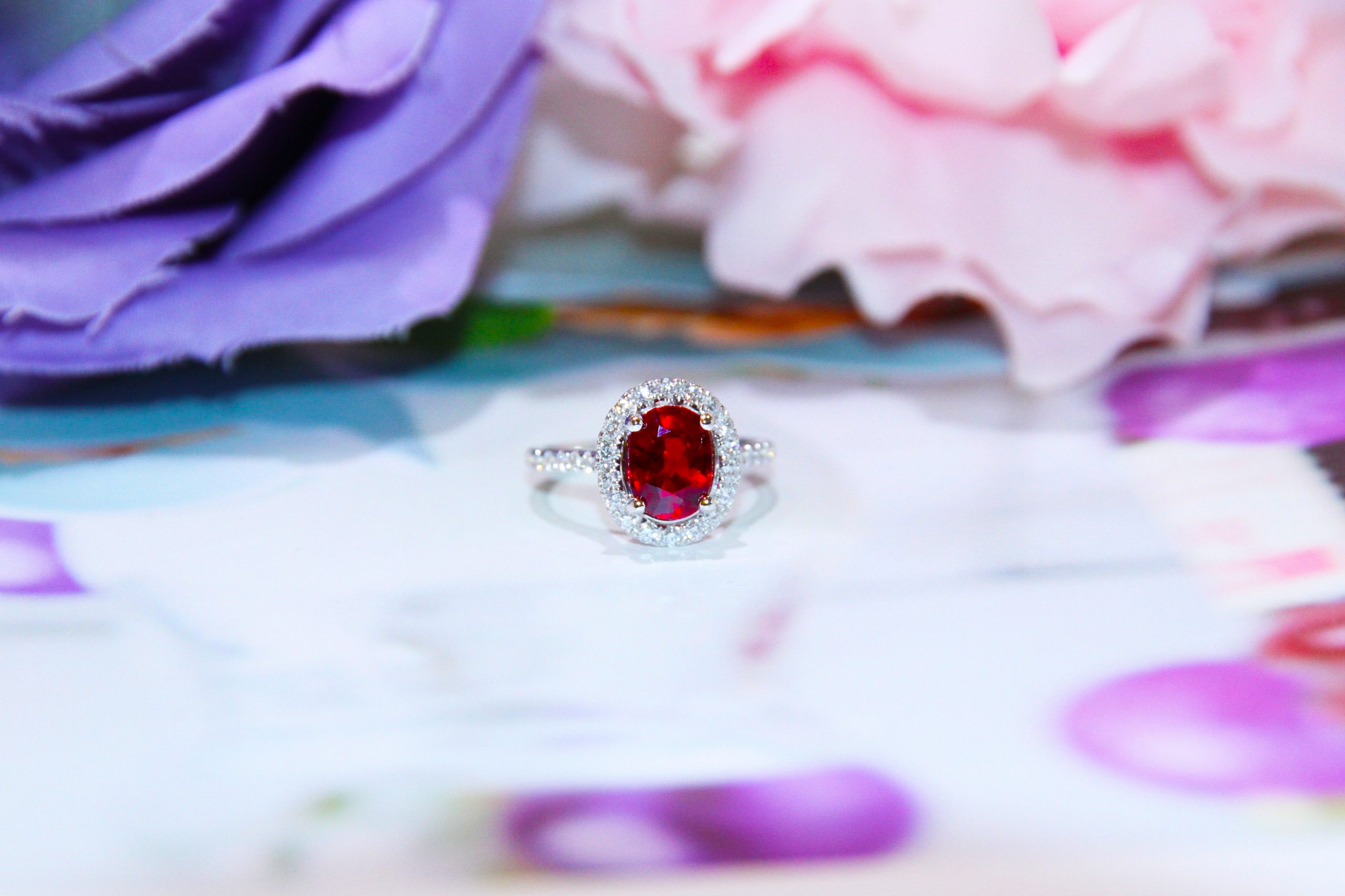 Red Ruby in 18k White Gold Halo Setting