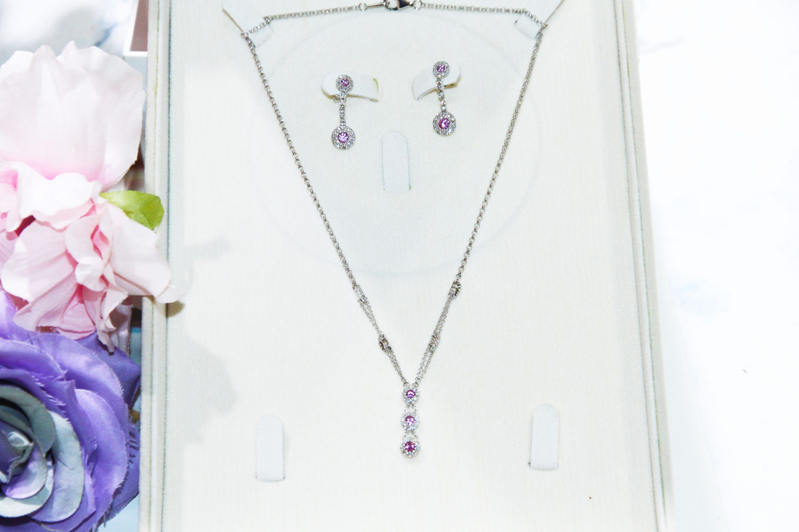 Pink Sapphire Necklace and Dangling Earrings in 18k White Gold