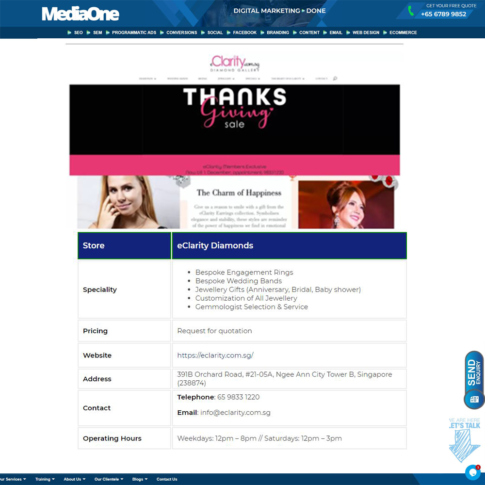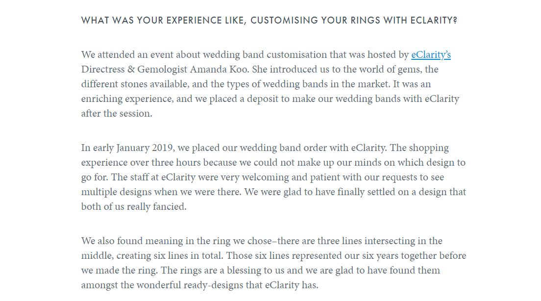 If you need more in information, you can always discuss with a gemologist, or schedule an appointment to see and try on more than 500 designs of engagement ring at eClarity. eClarity is voted number 1 by SingaporeBrides readers (https://singaporebrides.com/d/eclarity-diamonds). To know more, visit eClarity.com.sg, register for webinars eClarity.com.sg/register-for-webinars, or schedule an appointment at (65) 9833-1220.