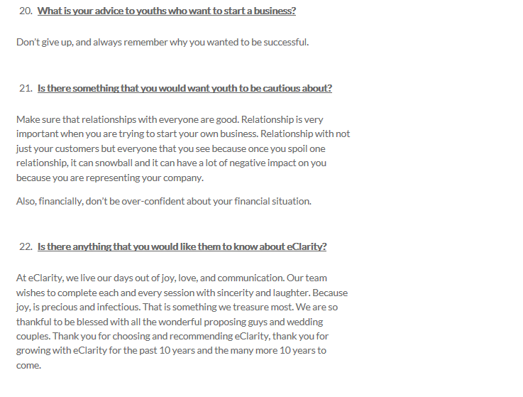 At eClarity, we live our days out of joy, love, and communication. Our team wishes to complete each and every session with sincerity and laughter. Because joy, is precious and infectious. That is something we treasure most. We are so thankful to be blessed with all the wonderful proposing guys and wedding couples. Thank you for choosing and recommending eClarity, thank you for growing with eClarity for the past 10 years and the many more 10 years to come.