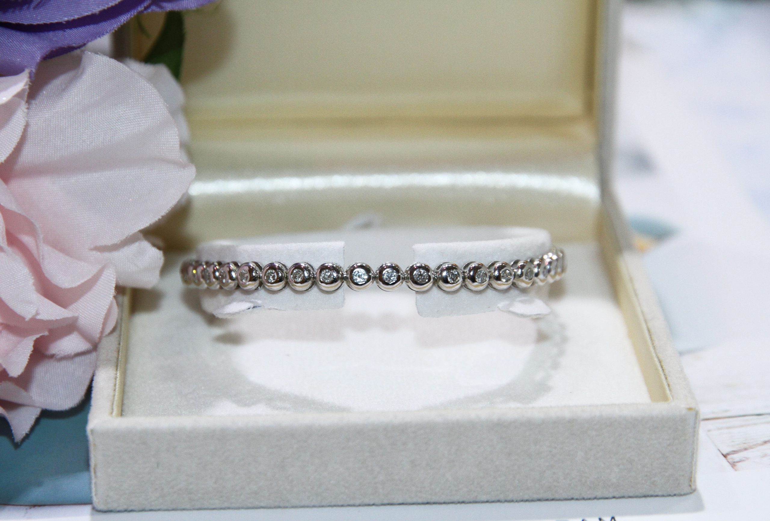 Bezel set tennis bracelet features each of the diamond surrounded completely by metal. This setting is very safe as they keep each diamond safely in place. However, this design tends to highlight the metal as much as the diamonds and minimize the diamond’s sparkle because of the reduced refraction of light.