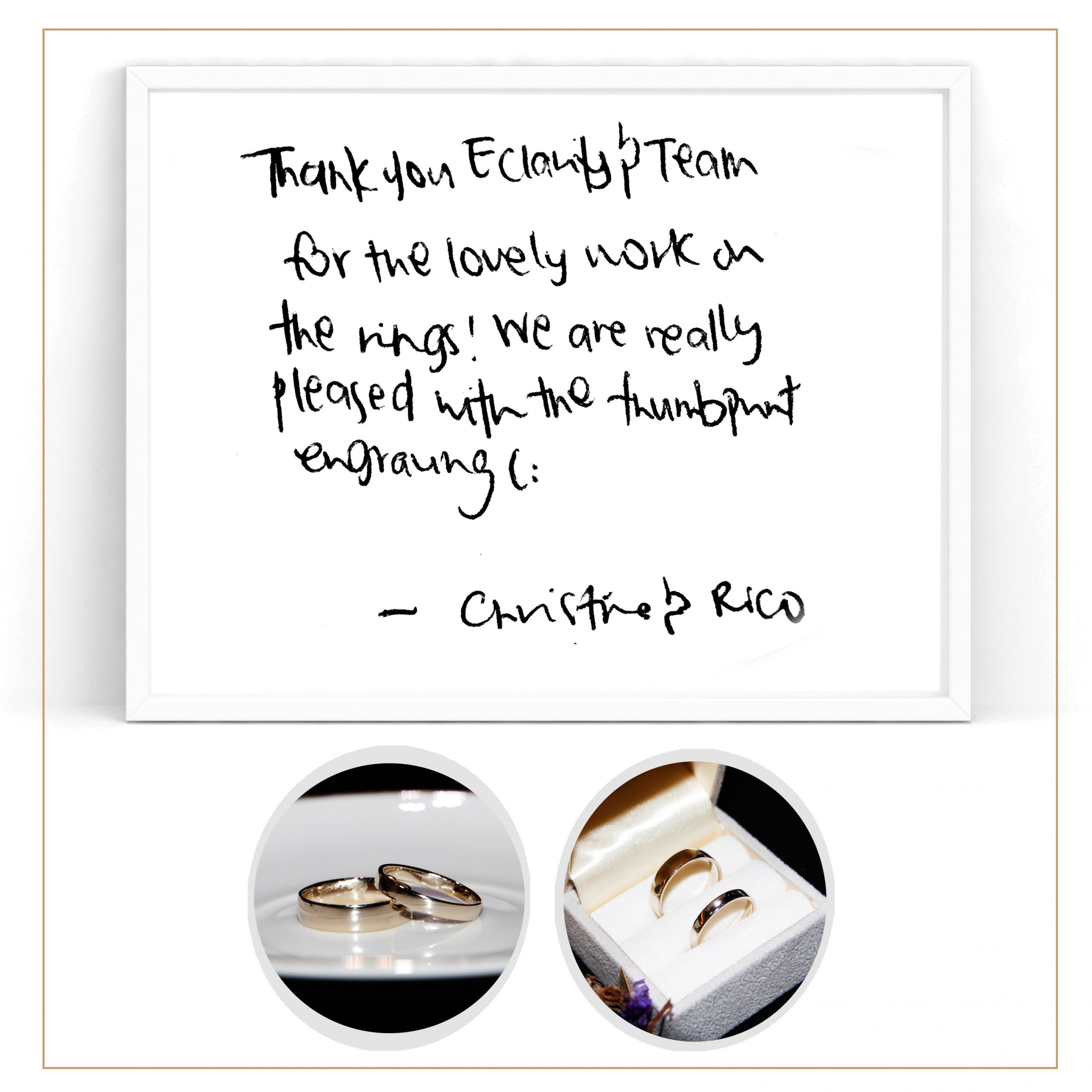 “Thank you eClarity & team for the lovely work on the rings! We are really pleased with the thumbprint engraving ?” – Christine & Rico