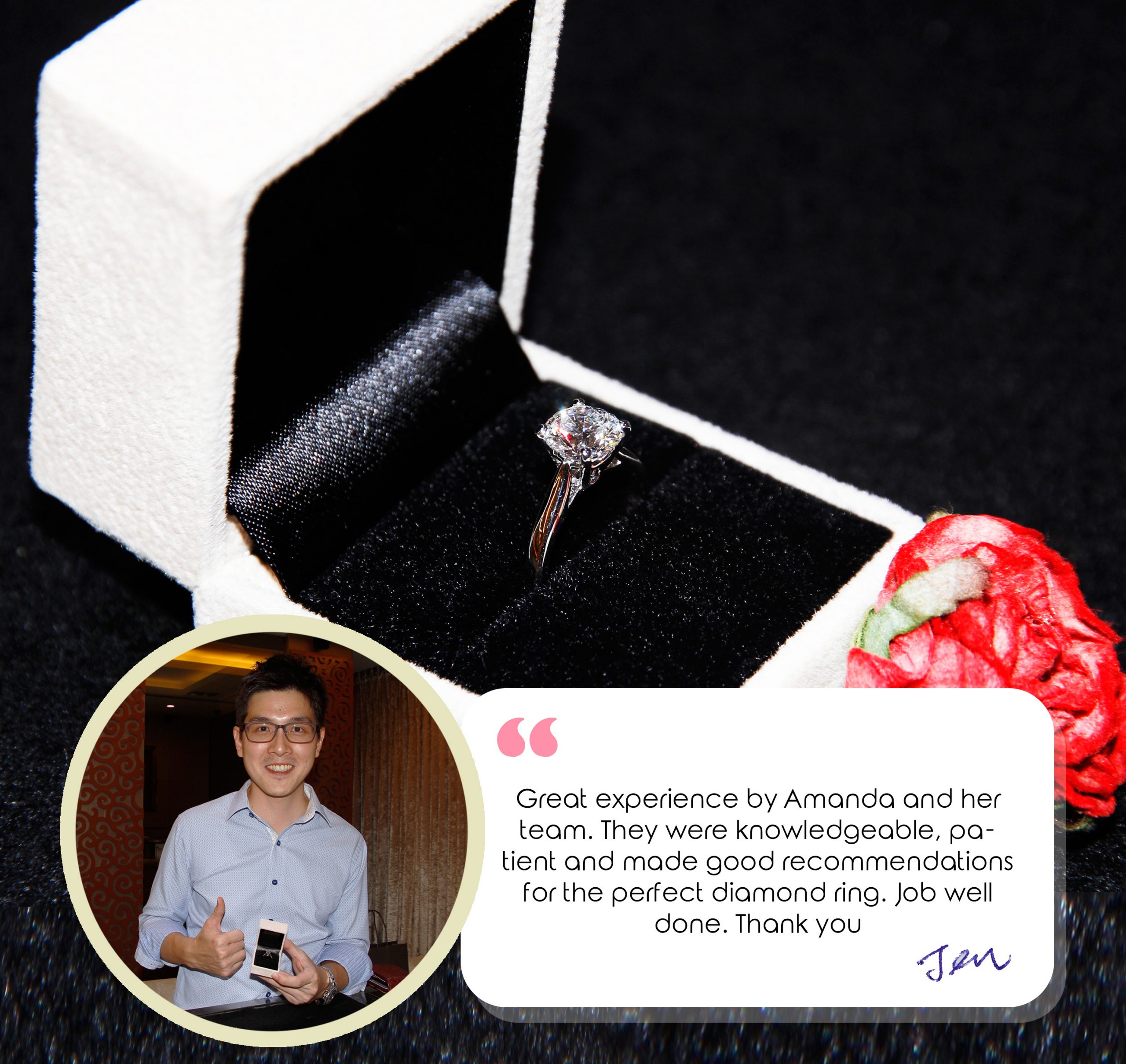 “Great experience by Amanda and her team. They were knowledge, patient and made good recommendations for the perfect diamond ring. Job well done. Thank you” – Jensen