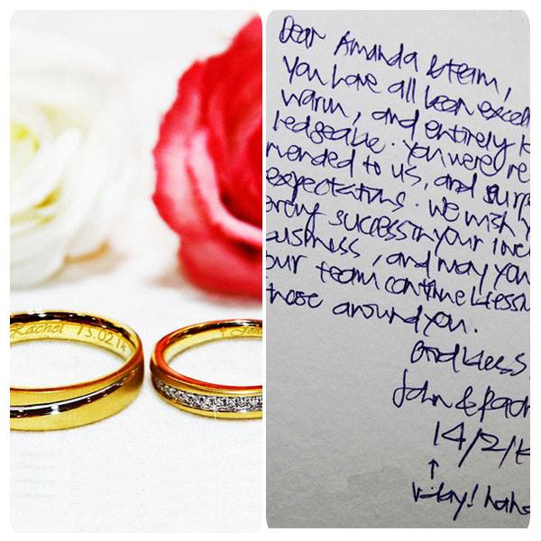 “Dear Amanda & team, You have all been excellent warm, and entirely knowledgeable. You were recommended to us, and surpassed expectations. We wish you every success in your lovely business, and may you & your team continue blessing those around you. God bless! – John & Rachel”