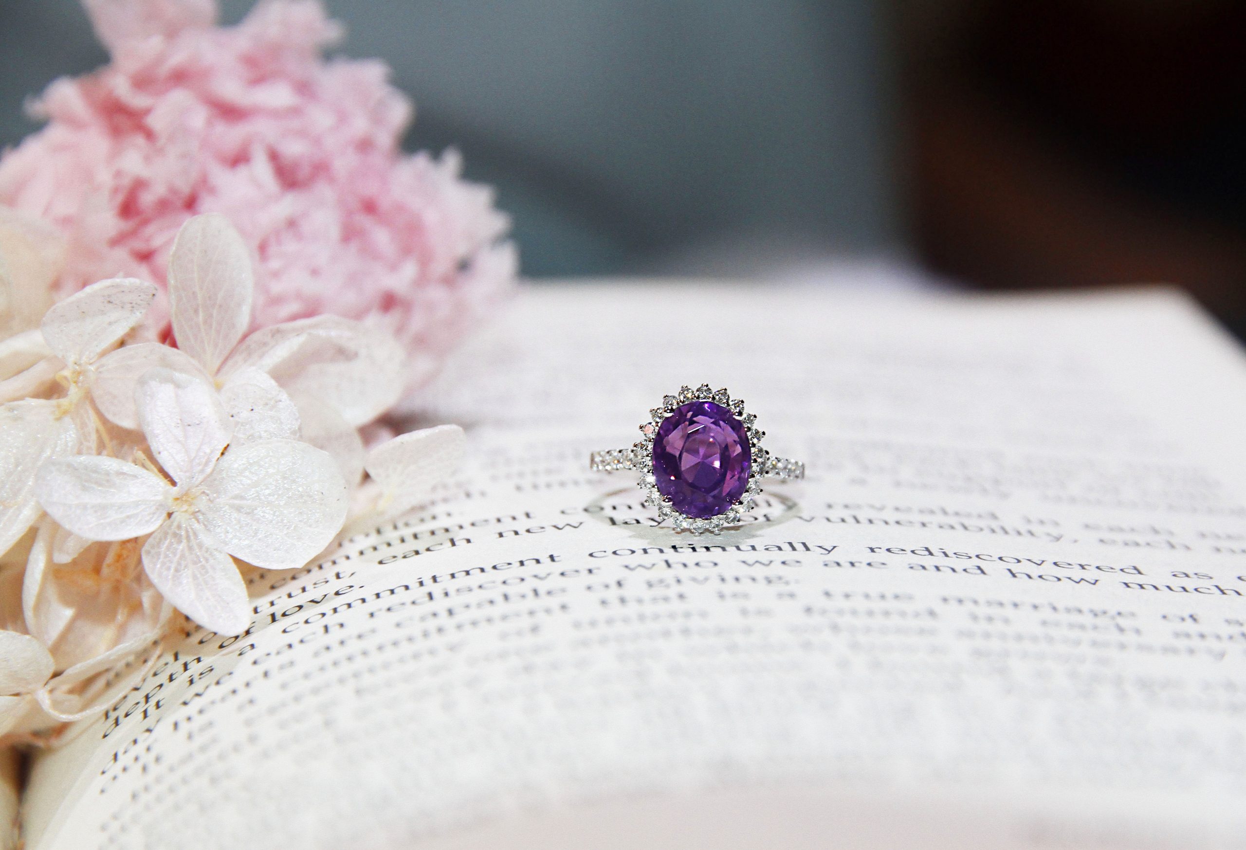 Amethyst is the most loved purple gemstone from the quartz family. It is famous for it’s representation for peace, calm, and tranquility, and is believed by some to have healing properties. It is also widely available and therefore affordable, but worth higher when it is carefully cut, mounted and customised into sophisticated design of engagement rings or wedding rings.