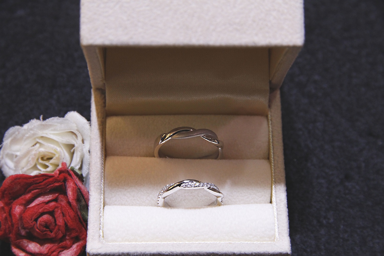 The fine curve has a slimming effect on the finger, while preserving the symbolic meaning of the wedding ring as a never-ending circle, signifying eternal love. The intertwining on the bands also represents the entwining and weaving of 2 lovers.